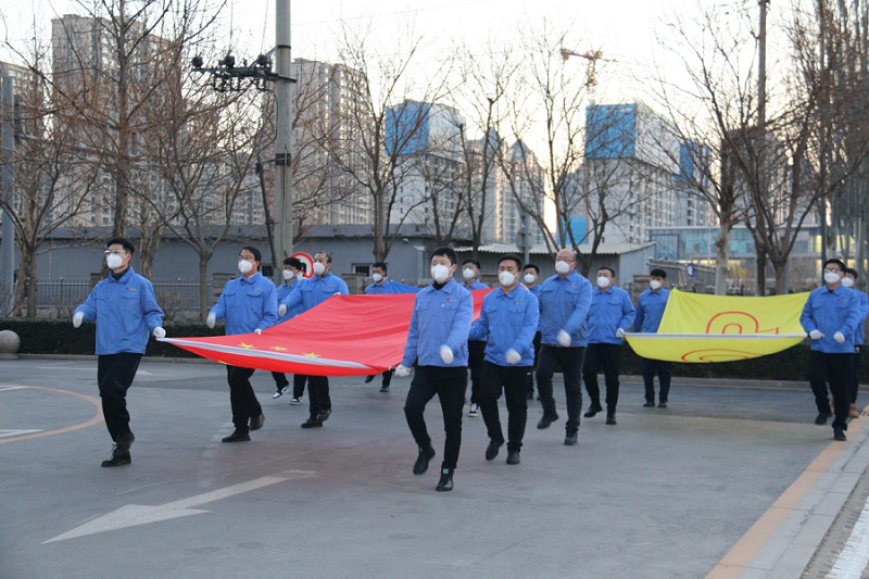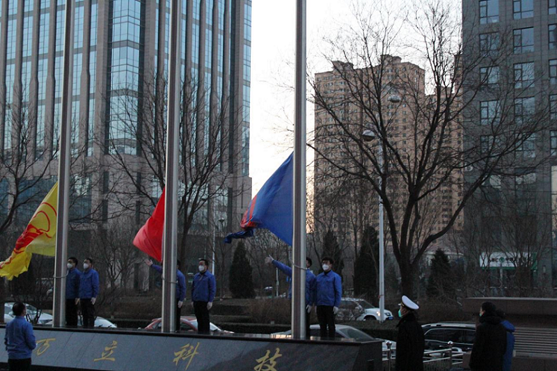 隨著《義勇軍進(jìn)行曲》的響起,三面旗幟伴著太陽一同升起,全體員工懷著激動的心情向國旗行注目禮。